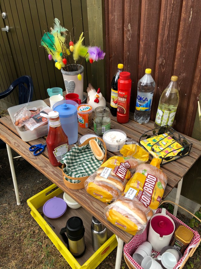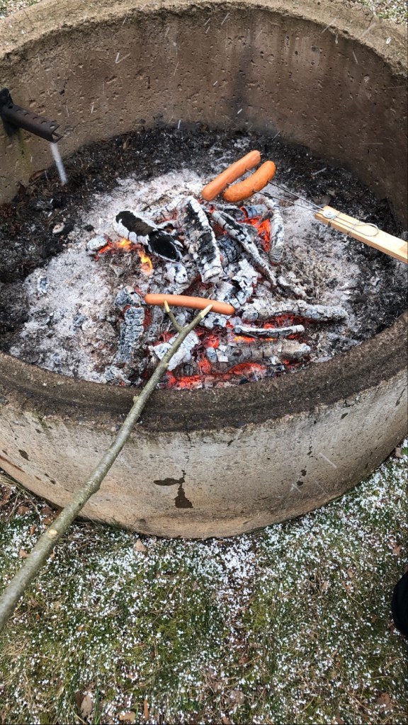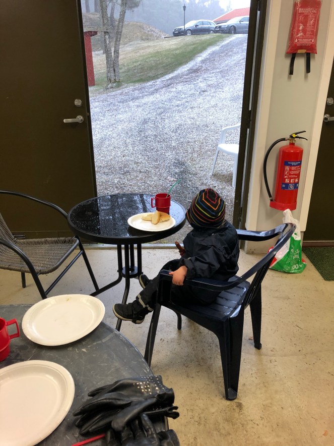 Hur som helst så trotsade vi vädret och grillade korv ändå. Men det där med att sitta ute blev det inget med. Vi fick flytta in i garaget och sitta inne och titta ut på snön som stundtals vräkte ner.