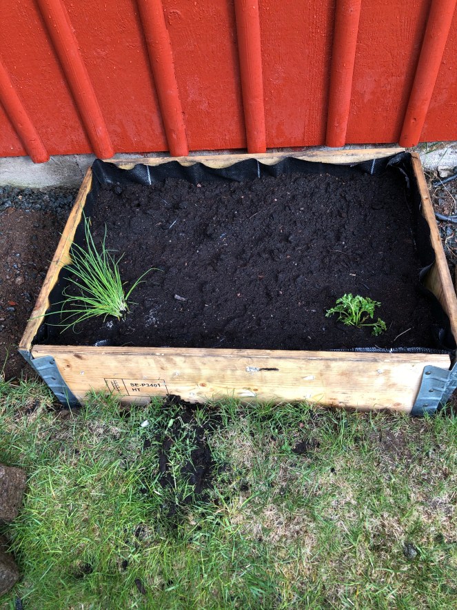 Själv har jag bl a klippt gräset och ordnat en pallkrage som jag ska ha alla mina kryddor i så småningom. Flyttade en gräslök och persilja från en annan pallkrage så de har redan ett litet försprång.