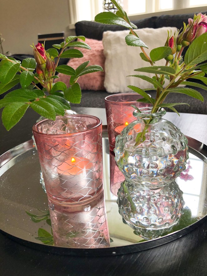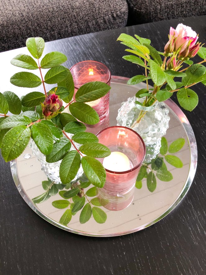 Just nu blommar nyponrosorna en andra omgång i trädgården och de luktar så gott så de fick följa med in och pryda soffbordet.